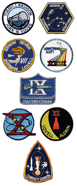 Tom Stafford and Eugene Cernan on Gemini IX designed the first oblong patch, showing a spacecraft and a docking vehicle with an astronaut floating free on a tether — for Cernan’s walk in space. John Young got his wife, a former commercial artist, to design the handsome red X which dominates the patch he and Michael Collins wore on Gemini X, and Pete Conrad and Richard Gordon underlined the fact that Gemini XI was an all-Navy crew by making their colors Navy blue and gold. They put them into a tall triangle, to indicate the fact that they were to achieve a particularly high apogee in this particular orbit.