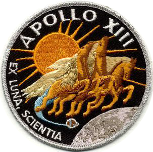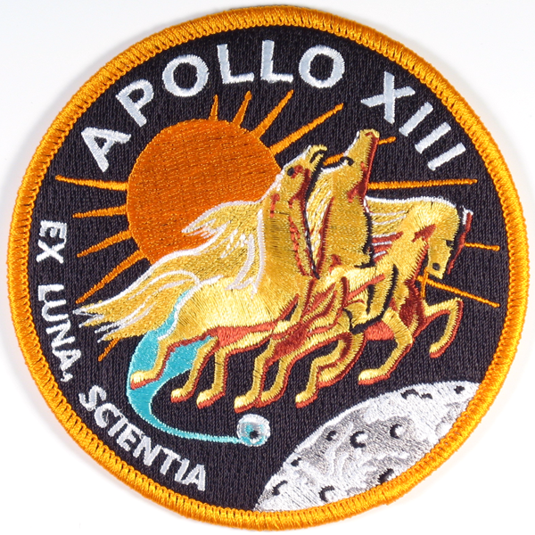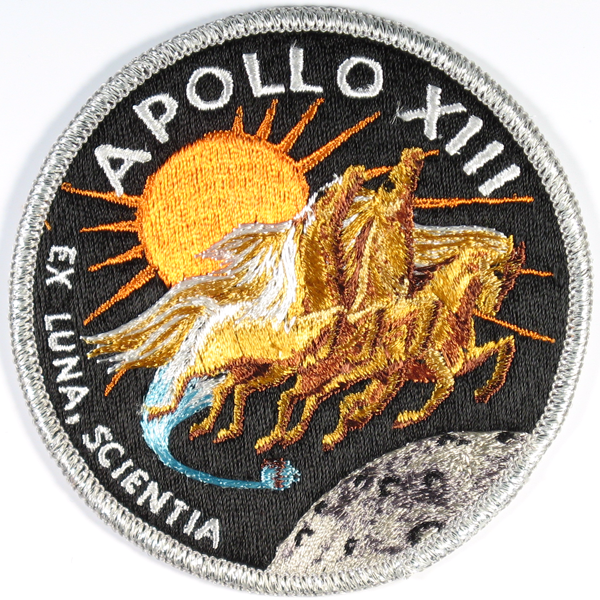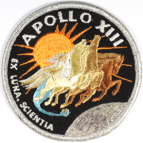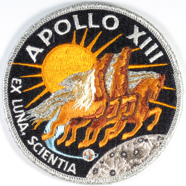 A variant AB Emblem embroidered Apollo 13 patch. While this is a lovely rendering, the horses are of different colors, rather than all the same, as in the artwork. There are no craters on the moon. Both AB and Lion Bros patches have a silver rim, rather than orange as in the design.