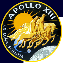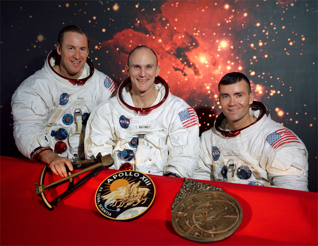 Beginning with Apollo 13 it became customary to include the crew patch as part of the official crew portrait. The custom continued through Apollo 17. This portrait shows the original crew, prior to the last-minute substitution of John Swigert for Ken Mattingly.